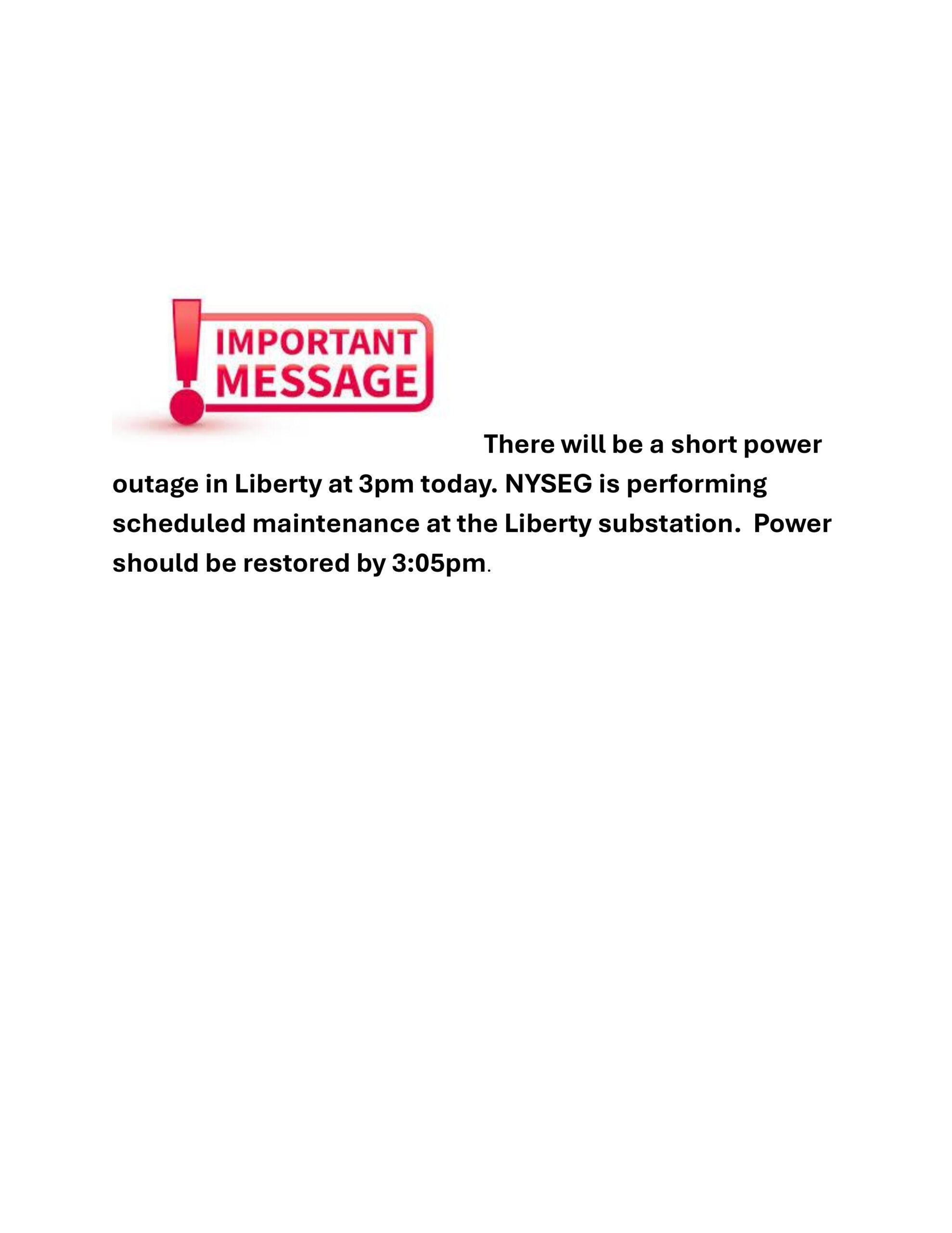 Power Outage in Liberty from 3:00pm – 3:05pm